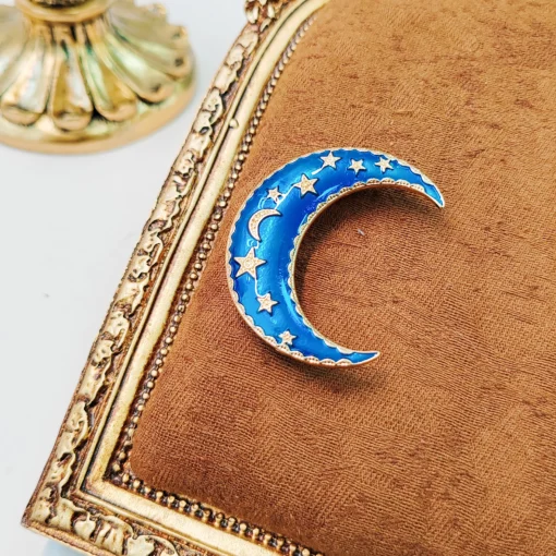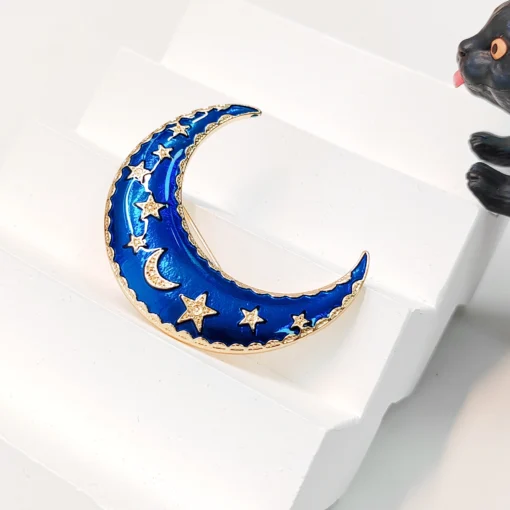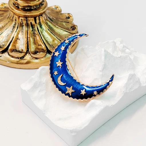 Crafted with deep azure planes flowing like captured nightfall – each graceful curve edged in luminous accents tracing pathways of starlight. Constellation patterns bloom in radiant harmony across the form, where gilded orbs dance beside a crescent muse, scattering cosmic whispers through nature’s serene artistry.